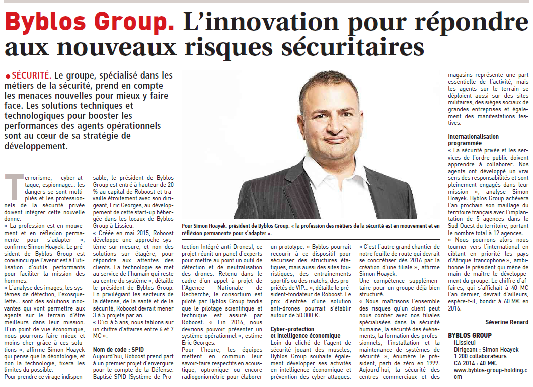 Byblos Group. L'innovation pour répondre aux nouveaux risques sécuritaires 16 septembre 2015 Séverine Renard Journal de l'Entreprise Byblos Group. L'innovation pour répondre aux nouveaux risques sécuritaires